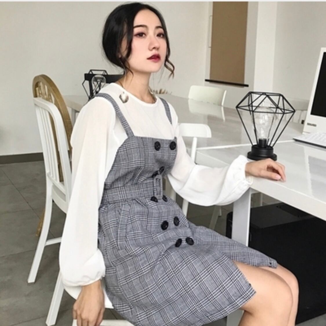 【お取り寄せ商品】ワンピース チェック ボタン 重ね着風 長袖 レトロ風 レディース ストラップ アンティーク風 韓国風 ミニ ベルト付き