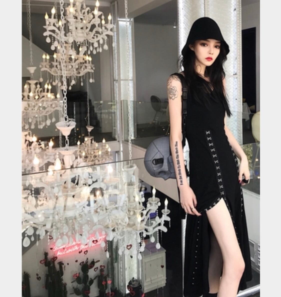 【お取り寄せ商品】ワンピース アウター 2点セット スリット レースアップ 編み上げ キャミワンピ サブカルチャー かっこいい セクシー フード