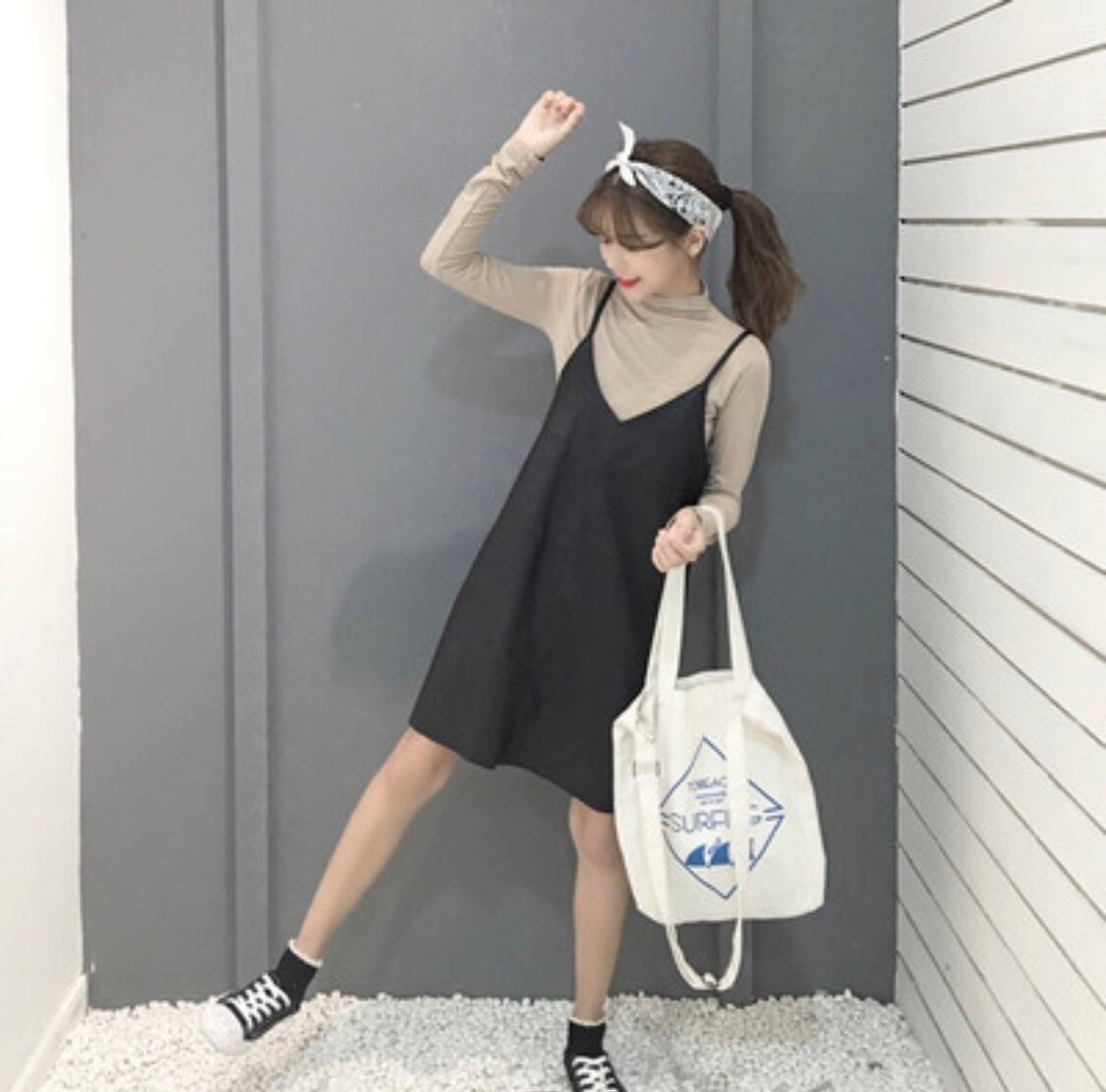 【お取り寄せ商品】2点セット ハイネック タートルネック 薄手 ワンピース シンプル カジュアル かわいい お買い得 春 おしゃれ レディース 韓国 レザー