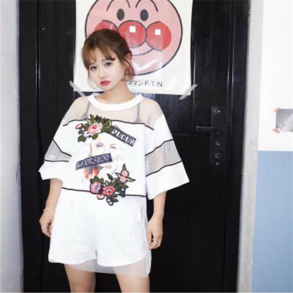 【お取り寄せ商品】トップス レディース 春 夏 メッシュ 刺繍 バラ 薔薇 ゆったり サブカルチャー 原宿 韓国 モノトーン プリント