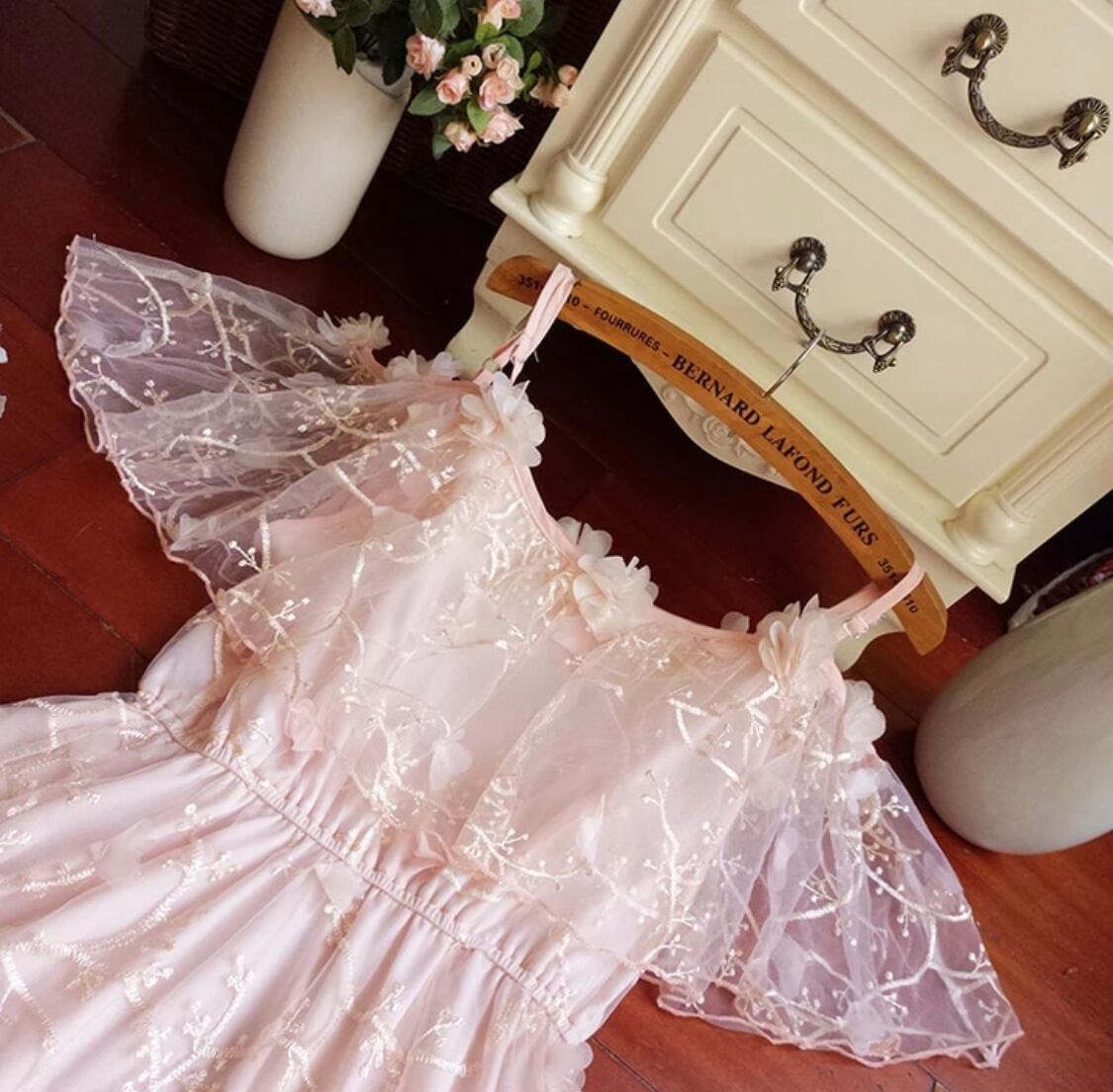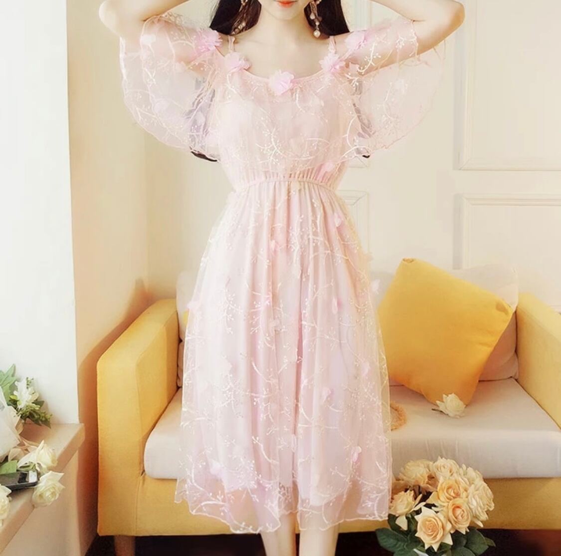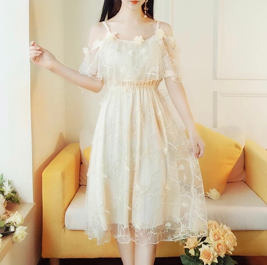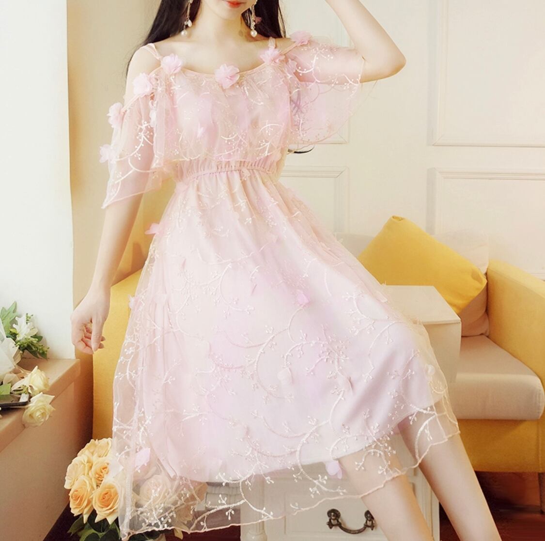 【お取り寄せ商品】ワンピース オフショルダー シフォン チュール 刺繍 花柄 乙女 姫 ゆめかわいい パステル 夏 春 半袖 ミディアム丈 ふんわり
