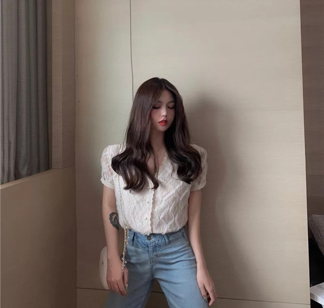 【お取り寄せ商品】シャツ トップス レディース Vネック レース 半袖 韓国 レトロ アンティーク