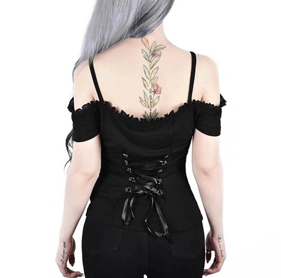 【お取り寄せ商品】オフショルダー 半袖 Tシャツ レースアップ 編み上げ リボン フリル モノトーン ブラック ゴシック セクシー パンク やみかわいい 夏 トップス レディース