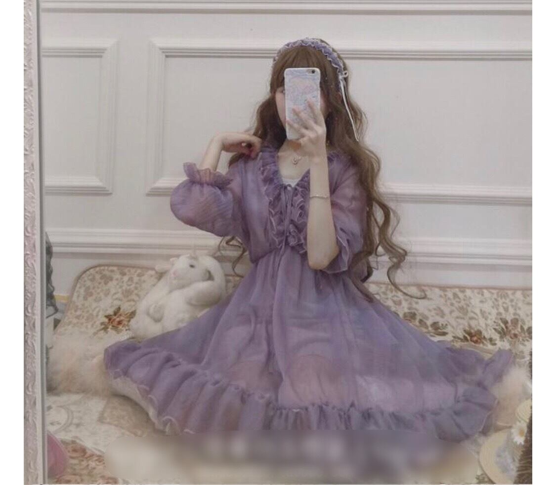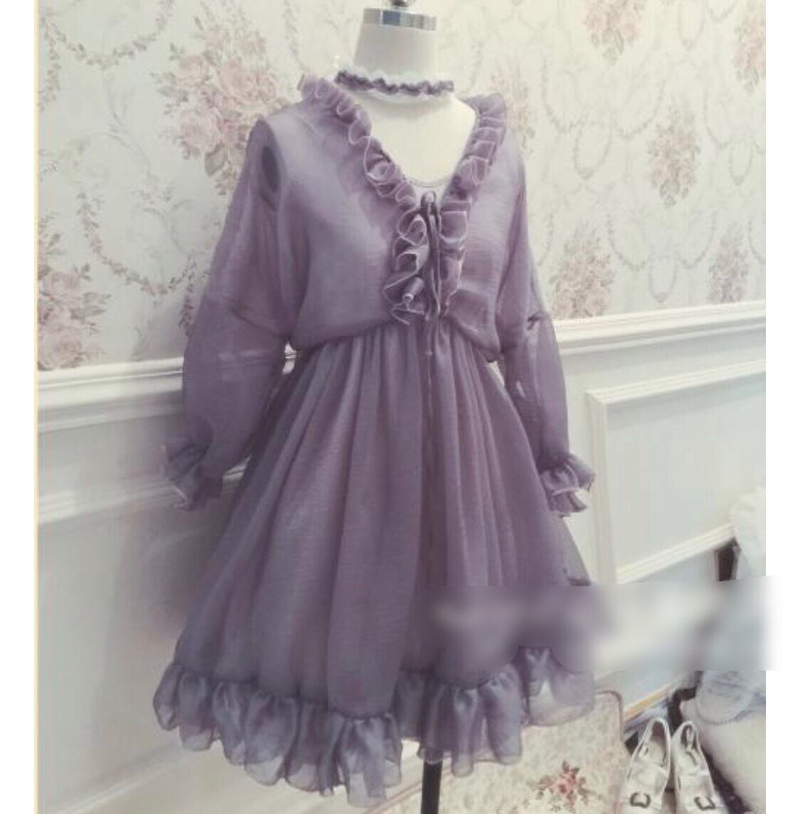 【お取り寄せ商品】ワンピース ゆめかわいい パステル パープル シフォン フリル 春 夏 ロリィタ 乙女 リボン 姫 7分丈 膝丈 レディース