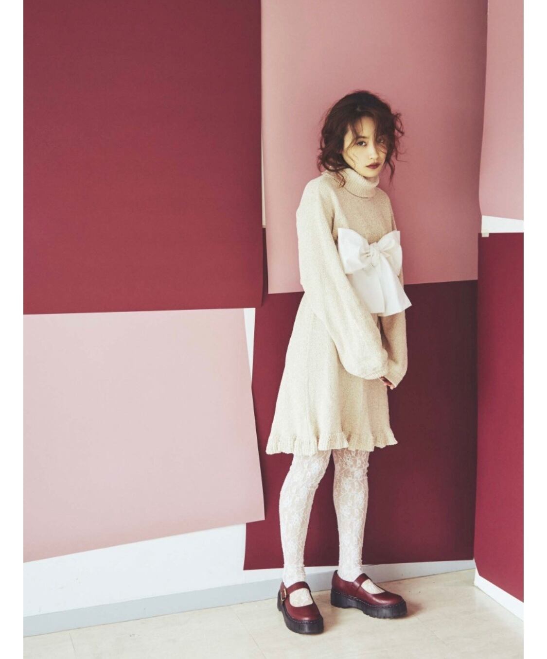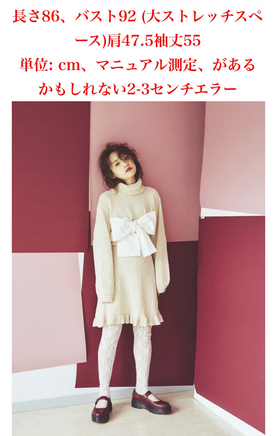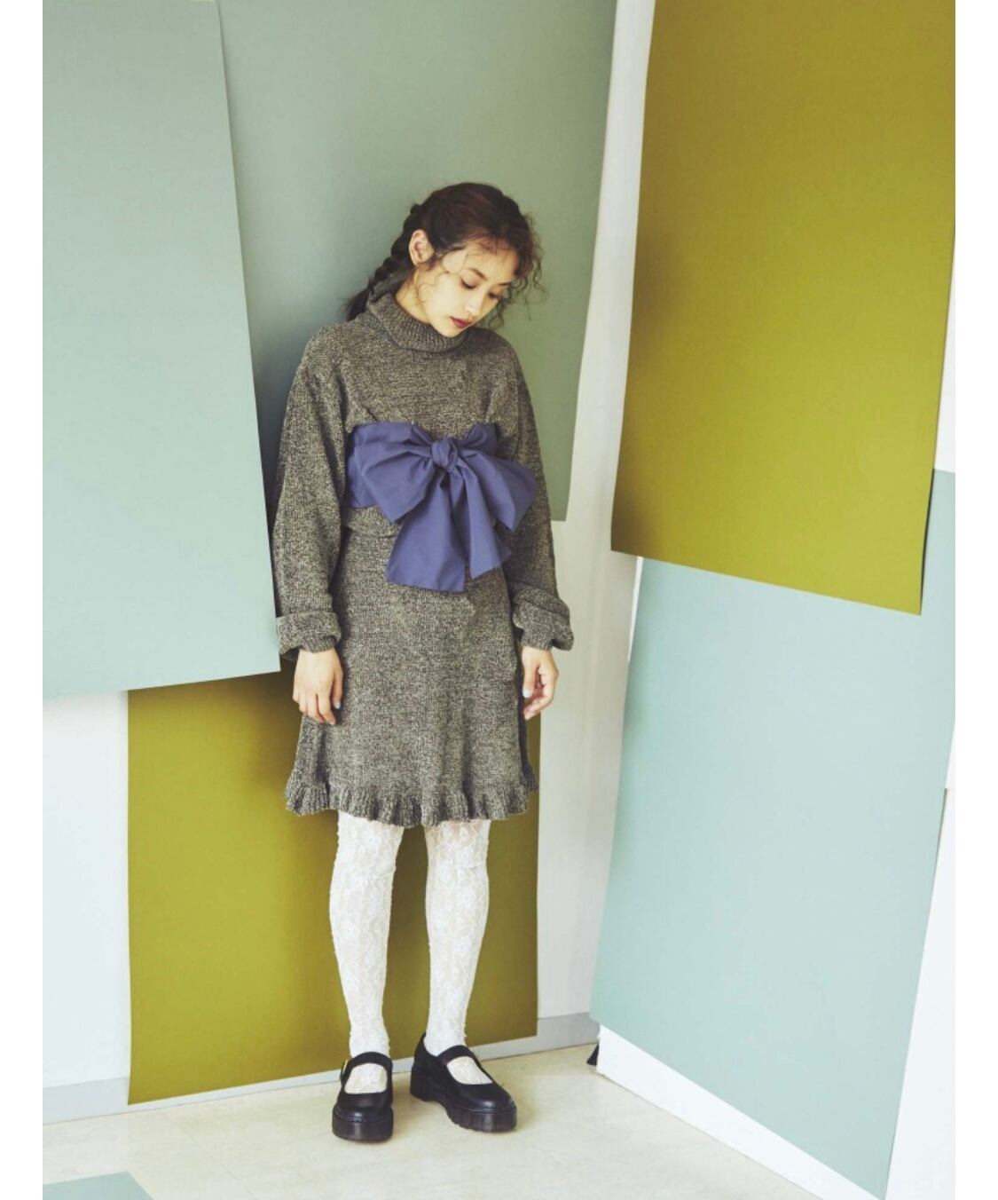 【お取り寄せ商品】ワンピース ニット ワンピ リボン 長袖 秋 冬 フリル ゆったり タートルネック ハイネック A W