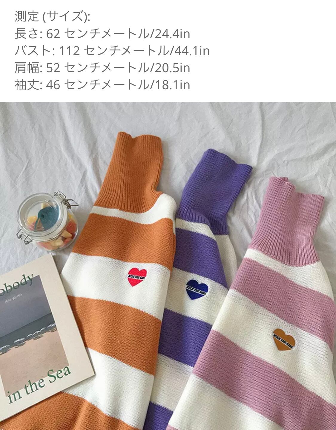 【お取り寄せ商品】ニット ハイネック ボーダー ハート 刺繍 原宿 ストリート レディース 秋 冬 長袖