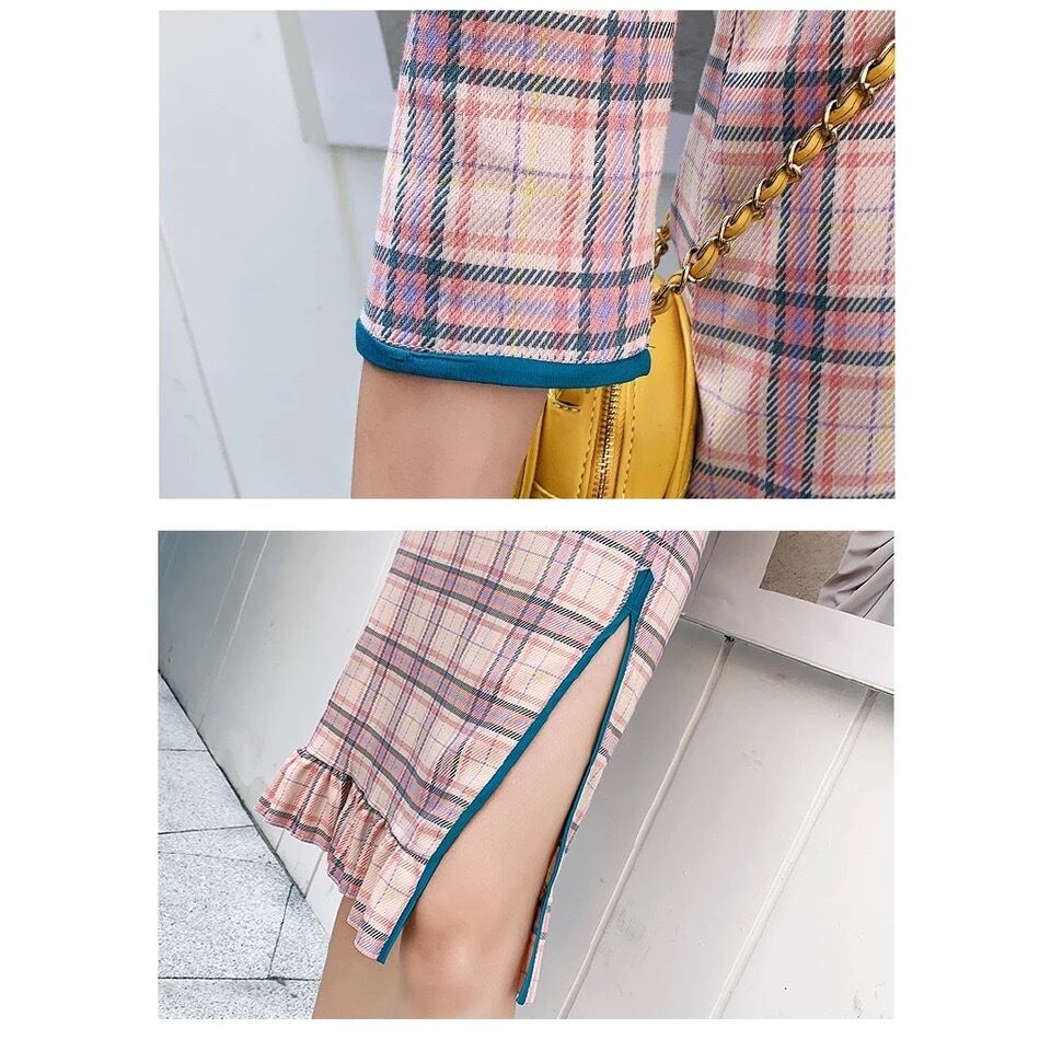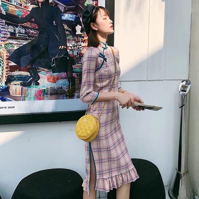 【お取り寄せ商品】ワンピース チャイナ 中華 七分袖 スリット セクシー 原宿 サブカルチャー フリル チェック レトロ レディース 夏 秋