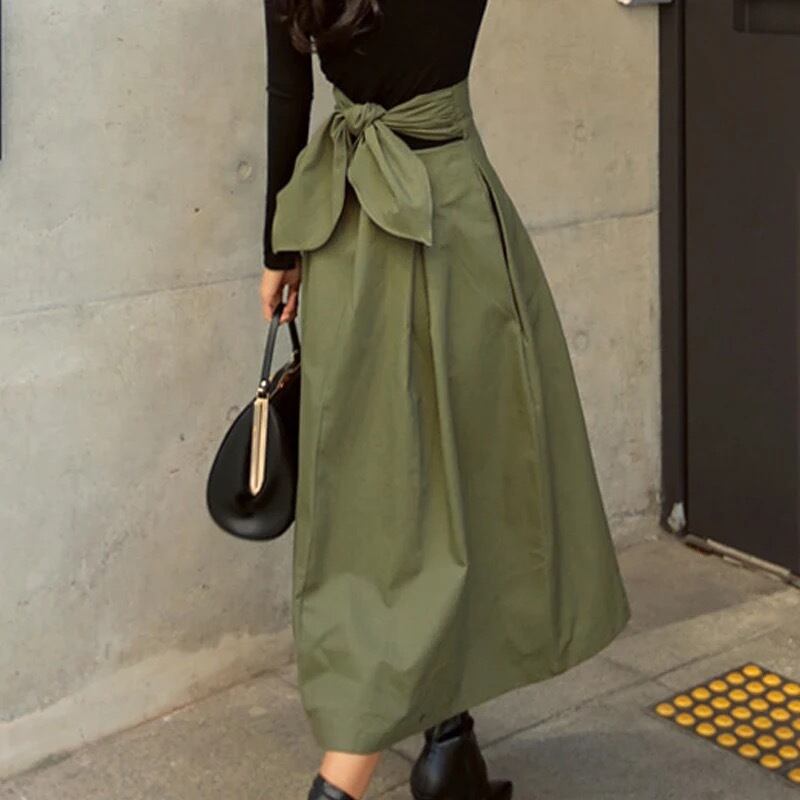 【お取り寄せ景品】スカート カーキ シンプル ロングスカート レディース ハイウエスト リボン