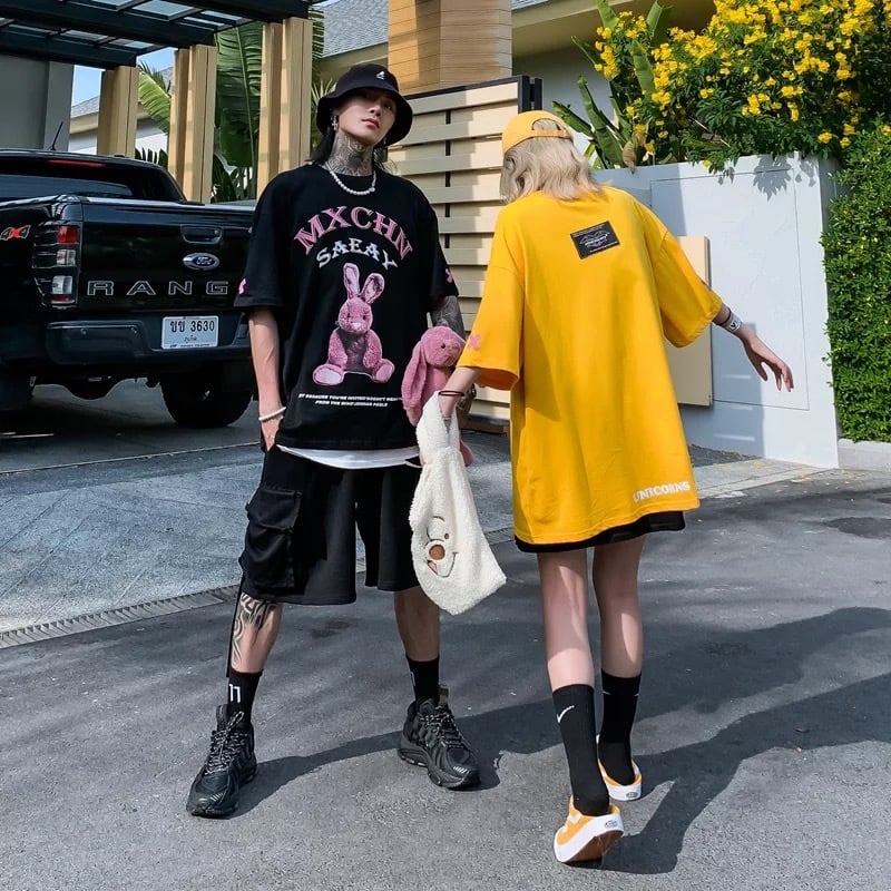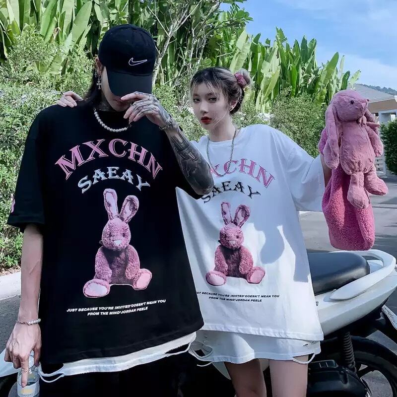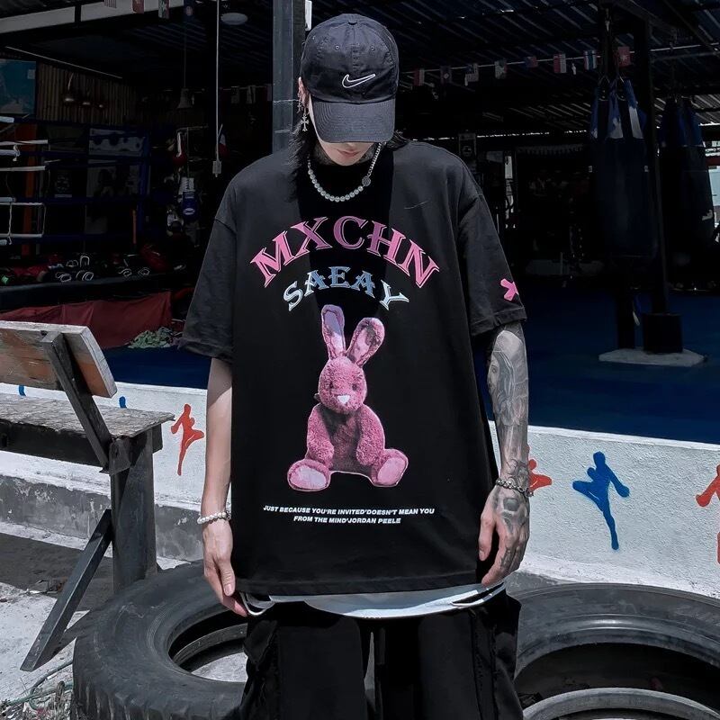 【お取り寄せ商品】Tシャツ 半袖 オーバーサイズ ゆったり サブカルチャー 原宿 ユニセックス おそろい うさぎ プリント