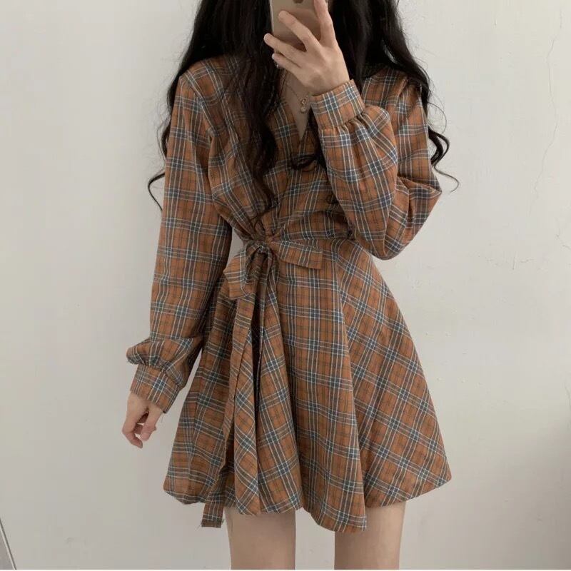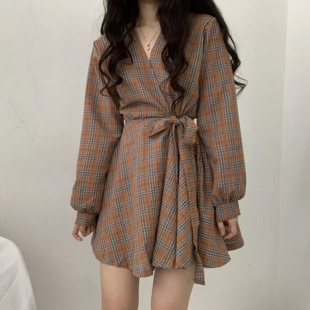【お取り寄せ商品】ワンピース Vネック レディース チェック 長袖 秋 冬 ショート丈 フレア リボン パフスリーブ