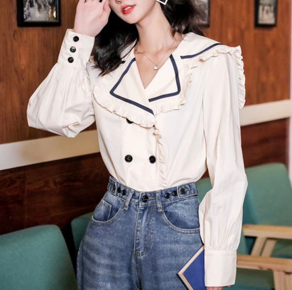 【お取り寄せ商品】シャツ 長袖 Vネック セーラー襟 レトロ アンティーク 原宿
