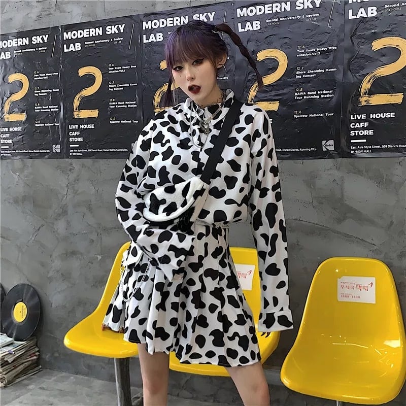 【お取り寄せ商品】上下セット 2点セット シャツ プリーツスカート ミニスカート フレアスカート レディース セットアップ 原宿 サブカルチャー 牛柄