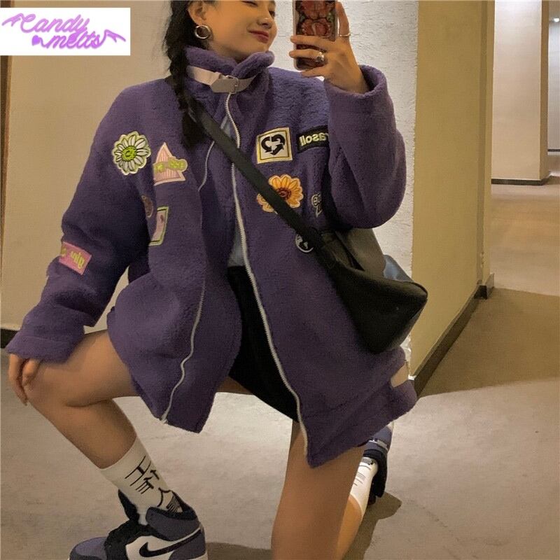 【お取り寄せ商品】アウター ジャケット ボア モコモコ ステッカー アップリケ 原宿 レディース 秋 冬 スタンドネック