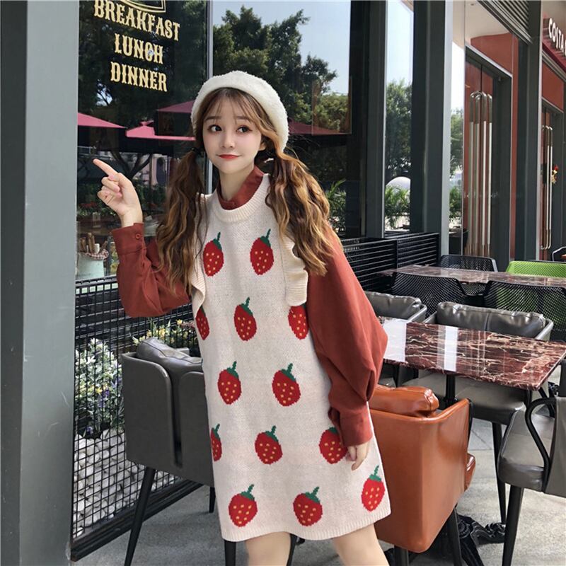 【お取り寄せ商品】2点セット ワンピース ニットワンピース シャツ トップス スタンドネック パフスリーブ フリル いちご 苺 イチゴ 原宿 ゆめかわいい