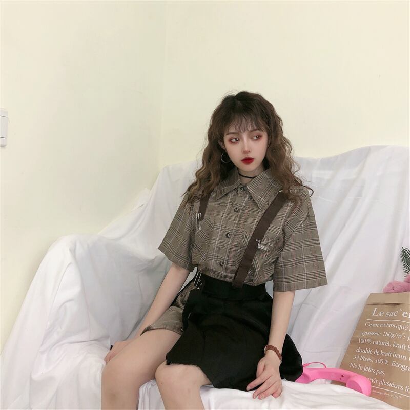 【お取り寄せ商品】ワンピース チェック 半袖 原宿 アシンメトリー ショート丈 スカート カジュアル
