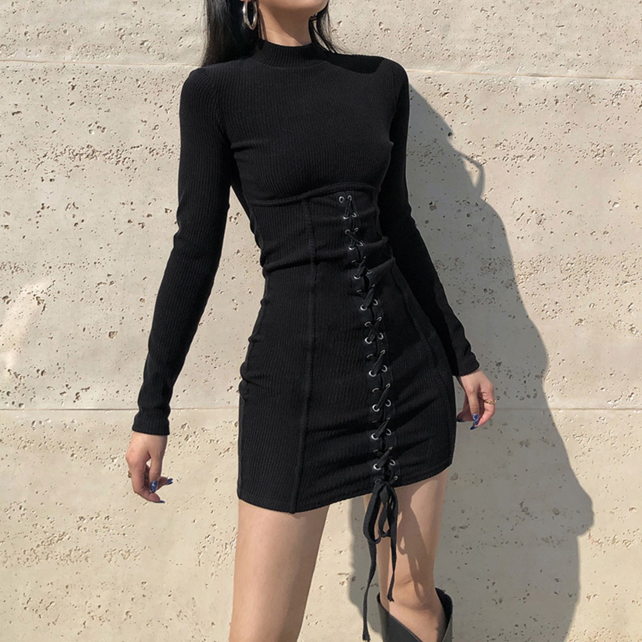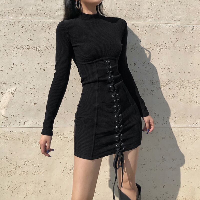 【お取り寄せ商品】ニットワンピース タイトワンピース レディース 長袖 ショート丈 レースアップ 編み上げ セクシー ダーク ゴシック サブカルチャー 原宿 病み可愛い ハイネック