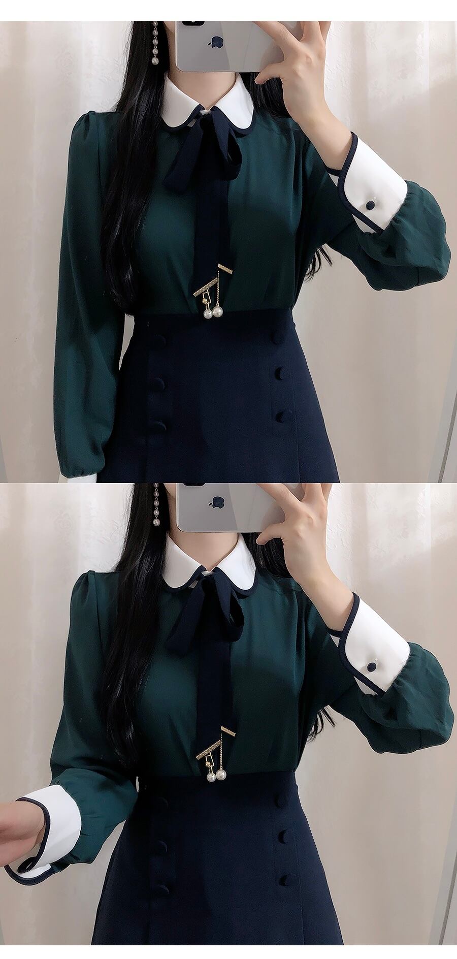 【お取り寄せ商品】トップス ブラウス シャツ レディース アンティーク レトロ お洒落 リボン 丸襟 パール