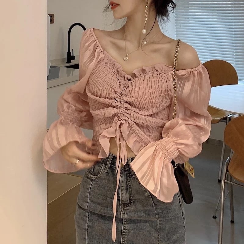 【お取り寄せ商品】トップス オフショルダー ショート丈 セクシー 長袖 シースルー パフスリーブ
