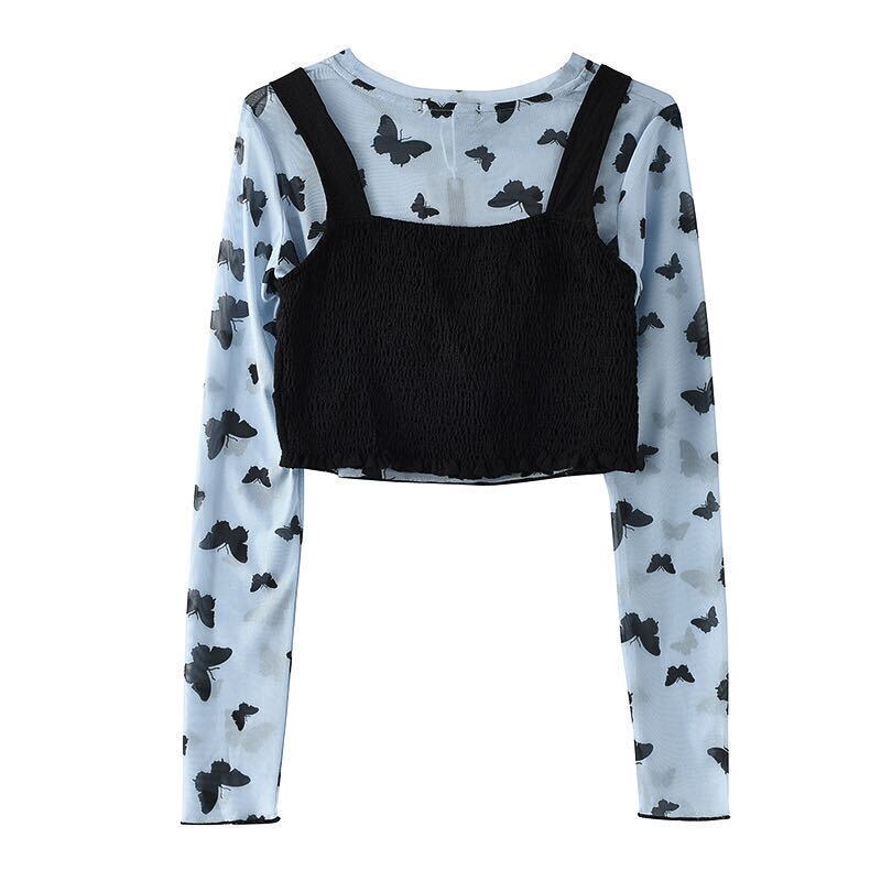 【お取り寄せ商品】トップス レディース 3点セット メッシュ タンクトップ 原宿 サブカルチャー 病み可愛い 蝶 チェーン ショート丈