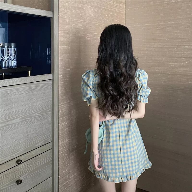【お取り寄せ商品】ワンピース 半袖 パフスリーブ フリル ミニ丈 レディース 可愛い チェック レトロ