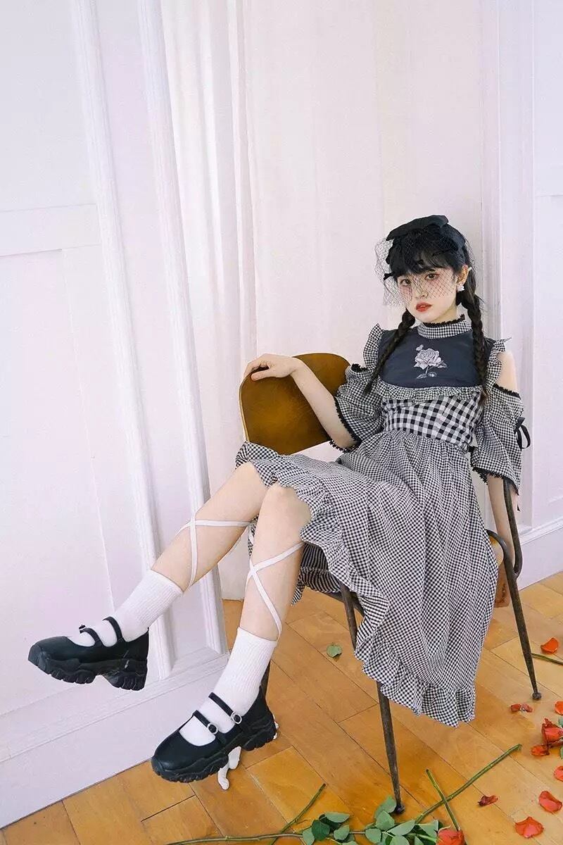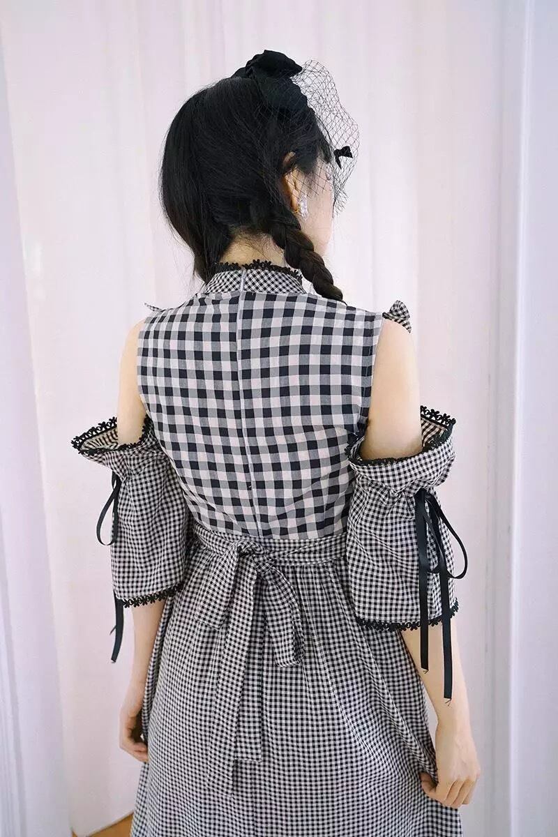【お取り寄せ商品】ワンピース オフショルダー チェック フリル リボン 薔薇 バラ ゆめかわいい 病み可愛い 原宿 サブカルチャー ロリィタ