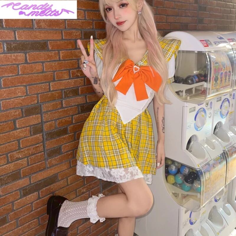 【お取り寄せ商品】ワンピース レディース セーラー風 リボン チェック 半袖 ゆめかわいい 原宿 サブカルチャー