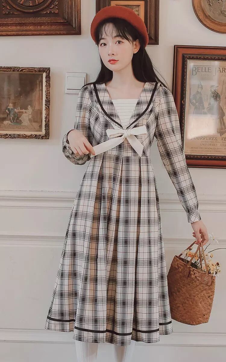 【お取り寄せ商品】ワンピース チェック セーラー 長袖 原宿 レトロ 森ガール