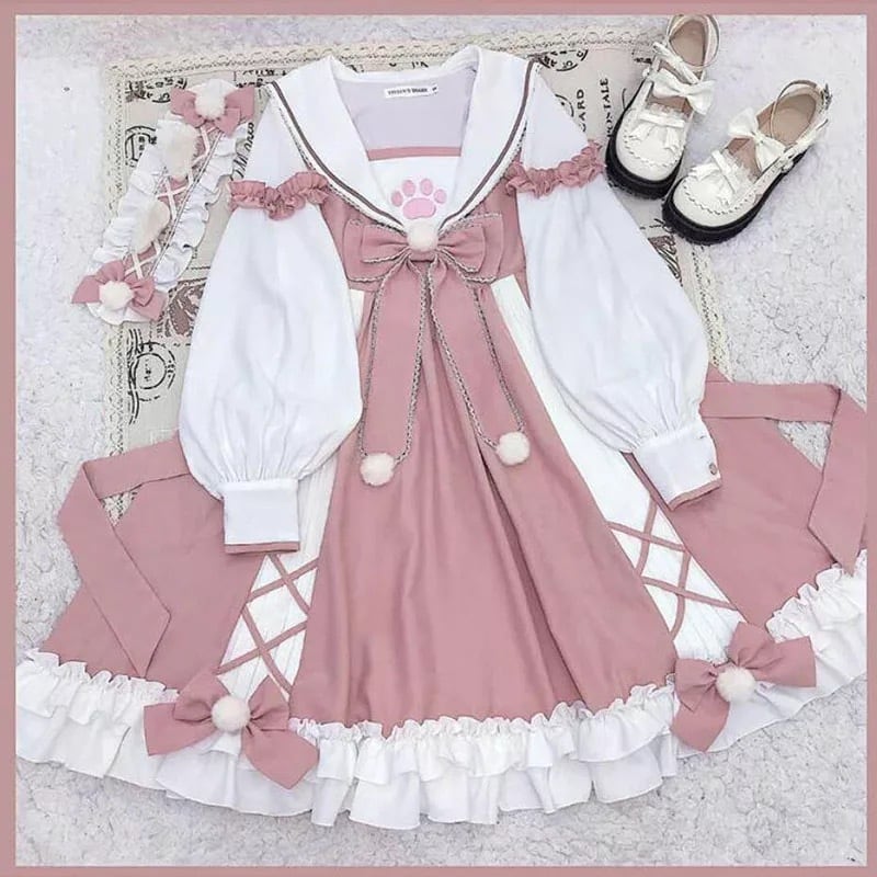【お取り寄せ商品】ワンピース 長袖 ロリィタ ロリータ ゆめかわいい 原宿 パステル リボン フリル パフスリーブ セーラー襟 猫耳